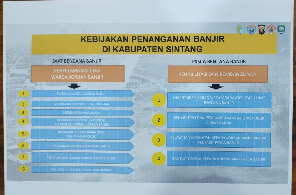 “Dalam menangani banjir ini, Pemerintah Kabupaten Sintang memutuskan beberapa kebijakan penting yakni penyelamatan jiwa warga korban banjir dengan melakukan evakuasi warga, membangun tempat pengungsian, membuat dan mengoperasikan dapur umum, mendistribusikan sembako, dan air bersih, menjamin ketersediaan stok kebutuhan pokok, pelayanan kesehatan, keamanan rumah warga, dan memberikan fasilitas untuk mobilitas orang dan barang,” ujarnya.
