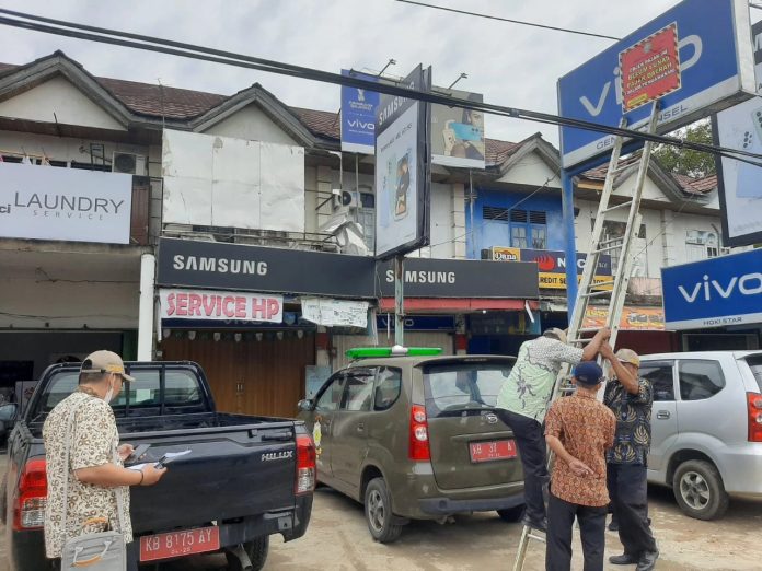 Pontianak, Kalbar – Badan Keuangan Daerah (BKD) Kota Pontianak bersama Satpol PP Kota Pontianak yang tergabung dalam Tim Penertiban Pajak Daerah (TPPD) Kota Pontianak menertibkan sebanyak 16 reklame berbagai merek. Reklame dari berbagai jenis seperti neon box, papan reklame dan lainnya disegel dengan spanduk maupun stiker bertuliskan ‘Reklame Ini Belum Membayar Pajak’. Tim Penertiban menyisir sejumlah titik lokasi di Jalan Khatulistiwa, Panglima Aim, Pattimura, MT Haryono dan Prof M Yamin.