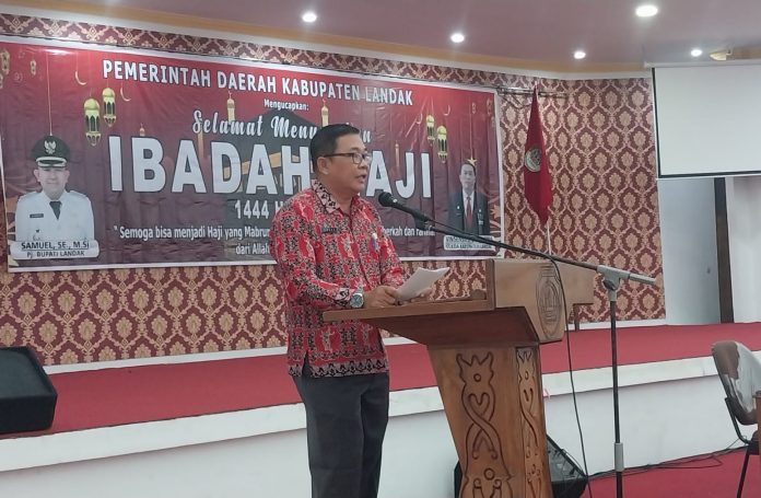 Landak, Kalbar – Asisten Pemerintahan dan Kesra Kabupaten Landak Yonas, mewakili Pj. Bupati Landak melepas Keberangkatan Jemaah Haji Kabupaten Landak Tahun 1444 H/2023 M di Aula Besar Kantor Bupati Landak dan di hadiri oleh Forkopimda Kabupaten Landak atau yang mewakili, Kepala Kantor Kemenag Kabupaten Landak, Staf Ahli Bupati Landak, Asisten Sekda Landak, Kepala OPD di Lingkungan Pemkab Landak, 63 orang calon Jemaah haji, dan tamu undangan lainnya. Kamis, (15/6/2023).