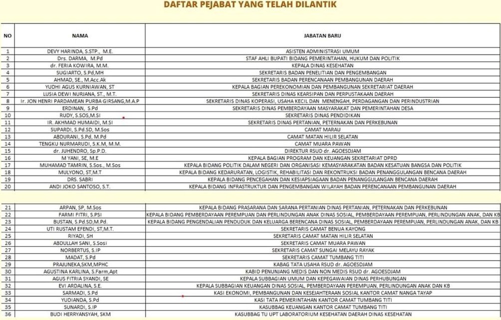 Dalam pelantikan tersebut, Bupati Ketapang mengatakan agar kepercayaan yang diberkan dapat diimbangi dengan dedikasi, kejujuran serta pelayanan yang maksimal untuk masyarakat. Selain itu ia mengingatkan untuk sering komunikasi dengan aparat penegak hukum agar dalam bekerja tidak melanggar hukum. Ia menyebutkan mutasi dan promosi merupakan kebutuhan organisasi serta menjadi bagian dari kehidupan organisasi dalam rangka pemantapan. Selain itu juga meningkatkan kapasitas kelembagaan dan bagian dari pola pembinaan karir pegawai.”Bangun komunikasi dan kerja sama yang efektif secara berjenjang, baik dengan atasan maupun bawahan. Tingkatkan motivasi dan semangat kerja agar tugas-tugas yang telah dipercayakan dapat dilaksanakan dengan baik,” ujarnya.