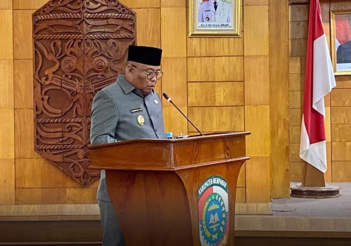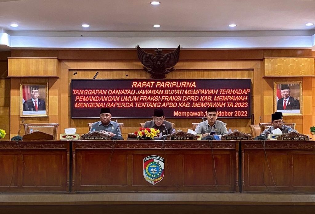 Mempawah, Kalbar – Wakil Bupati Mempawah, Muhammad Pagi menyampaikan tanggapan dan/atau jawaban Bupati Mempawah terhadap Pandangan Umum Fraksi-fraksi DPRD Kabupaten Mempawah mengenai Raperda tentang APBD Kabupaten Mempawah Tahun Anggaran 2023 dalam Rapat Paripurna yang digelar di Gedung DPRD Kabupaten Mempawah, Rabu (12/10).