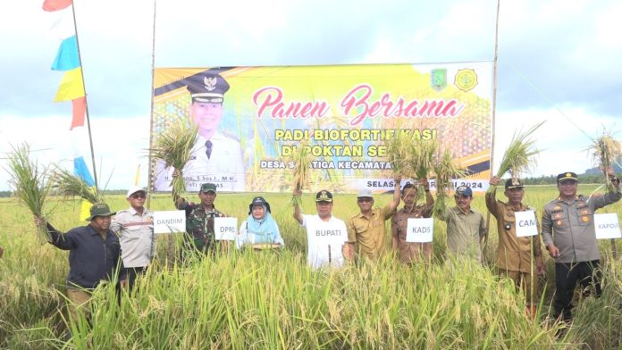 Sambas, Kalbar – Bupati Sambas H. Satono, S.Sos.I M.H panen raya padi biofortifikasi bersama Kelompok Tani Serasi, Dusun Seradi, Desa Salatiga, Kecamatan Salatiga, Kabupaten Sambas, Selasa (06/02).