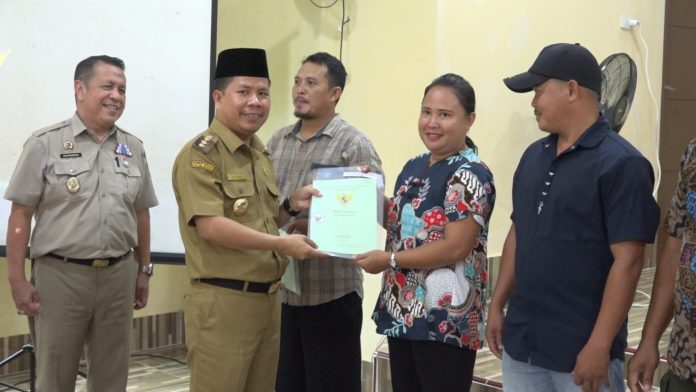 Sambas, Kalbar – Bupati Sambas H. Satono, S.Sos.I M.H bersama Kepala BPN Kabupaten Sambas menyerahkan sertifikat tanah untuk masyarakat Desa Balai Gemuruh, Kecamatan Subah, Kabupaten Sambas, Senin (26/02).