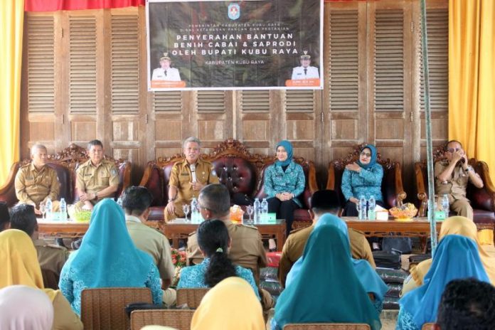 Kubu Raya, Kalbar – Menindaklanjuti instruksi Presiden Joko Widodo terkait upaya pengendalian inflasi daerah, Pemerintah Kabupaten Kubu Raya kembali menyalurkan bantuan benih cabai untuk delapan desa di Kecamatan Sungai Ambawang, Senin (9/1), di Halaman Rumah Adat Jawa Desa Jawa Tengah, Kecamatan Sungai Ambawang. Bantuan benih cabai dan sarana produksi pertanian (Saprodi) tersebut diserahkan langsung Bupati Kubu Raya Muda Mahendrawan kepada delapan kepala desa dari Desa Puguk, Durian, Mega Timur, Malaya, Jawa Tengah, Pancaroba, Teluk Bakung, dan Simpang Kanan.