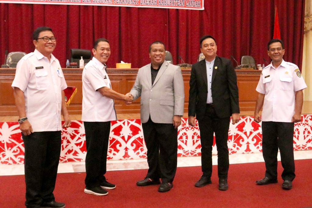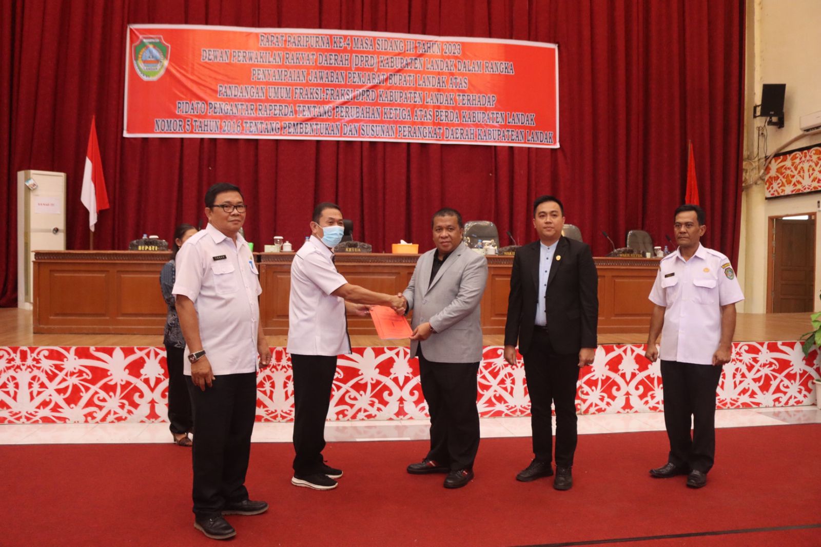 Dalam Pidato Jawaban Penjabat Bupati yang disampaikan oleh Sekda Landak Vinsensius memberikan penghargaan dan mengucapkan terimakasih yang setinggi-tingginya atas disampaikannya pemandangan umum fraksi-fraksi terhadap terhadap Raperda Perubahan Ketiga Atas Peraturan Daerah Kabupaten Landak Nomor 5 Tahun 2016 tentang Pembentukan dan Susunan Perangkat Daerah.