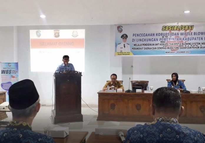 Mempawah, Kalbar – Bupati Mempawah Erlina membuka secara resmi Sosialisasi Pencegahan Korupsi dan Whistle Blowing System dalam upaya menjaga profesionalitas para ASN dan pejabat di lingkungan Pemkab Mempawah yang diselenggarakan oleh Inspektorat Kabupaten Mempawah. Dengan tema “Melalui Pendidikan Anti Korupsi dan Whistle Blowing System (WBS), Kita Wujudkan Perangkat Daerah dan Generasi Muda yang Sadar dan Paham Akan Bahaya Korupsi”.