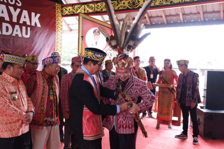 Sekadau, Kalbar – Bupati Sekadau, Aron menghadiri acara pelantikan Ketua dan Pengurus Dewan Adat Dayak (DAD) Kabupaten Sekadau periode 2022-2027, di Betang Youth Center, Kecamatan Sekadau Hilir, Kabupaten Sekadau, Rabu (18/1/2023).