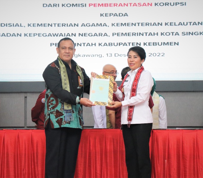Singkawang, Kalbar – Komisi Pemberantasan Korupsi (KPK) melakukan penyerahan aset hasil rampasan dari penanganan tindak pidana korupsi yang telah berkekuatan hukum tetap kepada 6 (enam) instansi yaitu Kementerian Agama, Kementerian Kelautan dan Perikanan (KKP), Badan Kepegawaian Negara (BKN), Komisi Yudisial (KY), Pemerintah Kota Singkawang, dan Pemerintah Kabupaten Kebumen.