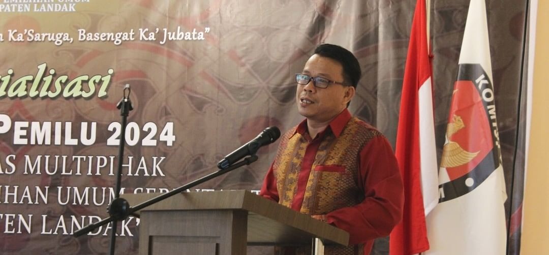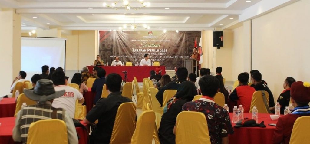Landak, Kalbar – Asisten Pemerintahan dan Kesejahteraan Rakyat Sekda Kabupaten Landak Yonas, S. Sos mewakili Pj. Bupati Landak membuka kegiatan Sosialisasi Tahapan Pemilu Tahun 2024 dengan tema Sinergisitas Multipihak Menyongsong Suksesnya Pemilihan Umum Serentak Tahun 2024 di Kabupaten Landak yang diselenggarakan oleh Komisi Pemilihan Umum Kabupaten Landak, di Hotel Grand Landak, Senin (10/10).