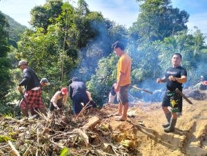 Kapuas Hulu, Kalbar – Masyarakat gotong royong membersihkan sisa longsor diruas jalan arah Boyan Hulu, Desa Riam Mengelai – Desa Nanga Sangan Kecamatan Boyan Tanjung, (11/03)
