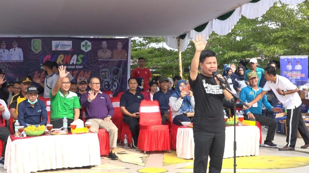 Sambas, Kalbar – Bupati Sambas H. Satono, S.Sos,I M.H bersama Ketua TP PKK Kabupaten Sambas mengikuti senam Germas (Gerakan Masyarakat Hidup Sehat) yang dilaksanakan di Taman Lunggi Sambas, Kecamatan Sambas, Senin (17/10).
