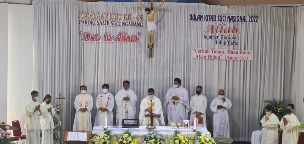 “Selamat meperingati Hari Ulang Tahun Ke-44 Paroki Salib Suci Ngabang dan marilah kita bergembira ria merayakan Hari Ulang Tahun Gereja Katolik Salib Suci Ngabang yang sudah eksis selama 44 tahun ini,” ujar Vinsensius.