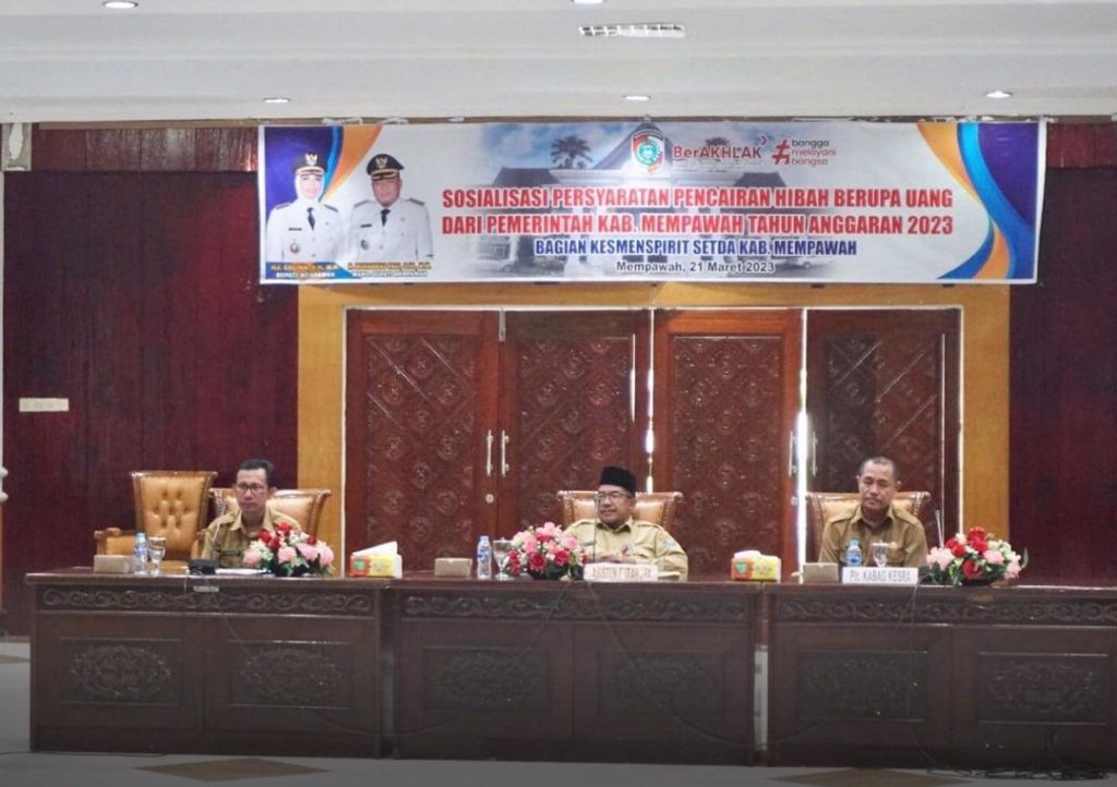 “Proses pelaksanaan hibah yang dilaksanakan oleh Pemkab Mempawah selalu mengedepankan azas keadilan, kepatutan, rasionalitas, tertib administrasi dan memberikan nilai manfaat kepada masyarakat dan pemerintah,” ujarnya saat membuka Sosialisasi Persyaratan Pencairan Hibah berupa uang tunai dari Pemerintah Kabupaten Mempawah TA 2023 di Balairung Setia Kantor Bupati Mempawah, Selasa (21/3).