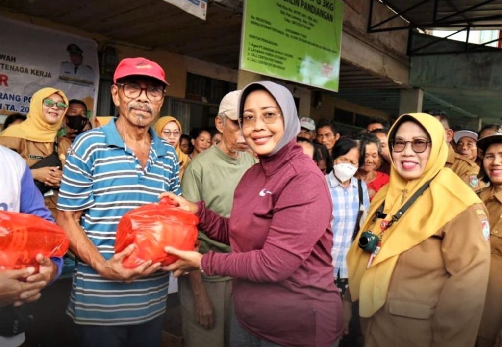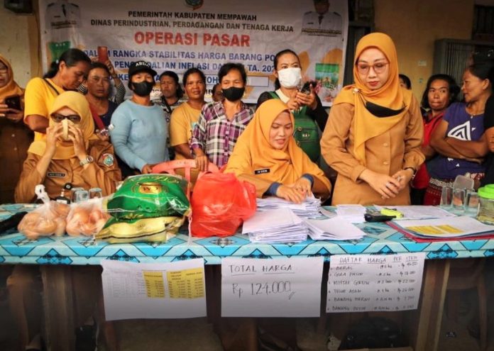 Mempawah, Kalbar – Bupati Mempawah Erlina yang didampingi oleh Camat Toho Ferdinanda meninjau pelaksanaan operasi pasar dalam rangka langkah konkret upaya menekan inflasi serta menstabilkan harga bahan pokok, di Pasar Toho, Selasa (1/11) Pagi.