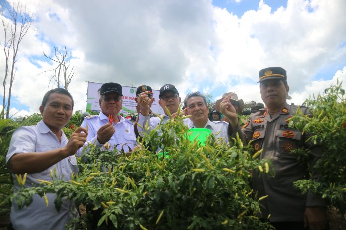 Sanggau, Kalbar – Rabu, 6 Desember 2023 tepatnya pukul 08.30 WIB, Penjabat Gubernur Kalimantan Barat dr. H. Harisson, M.Kes bersama Penjabat Ketua Tim Penggerak PKK Ny. Windy Prihastari Harisson. S.STP., M.Si., tiba di Desa Pedalaman Kecamatan Tayan Hilir Kabupaten Sanggau dalam rangkaian kegiatan Gerakan Tanam (Gertam) Cabai bersama masyarakat sekitar. Kegiatan yang di inisisasi oleh Tim Penggerak PKK dan Dinas Tanaman Pangan dan Hortikultura ini adalah sebagai salah satu langkah dalam hal pengendalian Inflasi di Kalimantan Barat. Dalam sambutannya, Penjabat Gubernur menyambut baik dengan diadakannya kegiatan Gertam ini, selain bisa meningkatkan perekonomian masyarakat kegiatan ini juga di harapkan bisa menurunkan angka inflasi Kalbar dimana pada bulan Desember ini angka inflasi kita masuk peringkat ketiga terendah di Indonesia. “Jadi kita minta ibu-ibu PKK untuk melekukan tanam cabai karena memang di Kalimantan Barat ini cabai menjadi salah satu faktor yang mendorong inflasi” ungkap Harisson. (6/12)