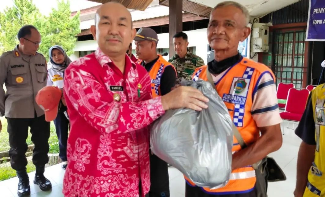 Landak, Kalbar – Pj. Bupati Landak Samuel, SE, M.Si Menyerahkan secara langsung Bantuan Sosial (Paket Sembako) dan Bantuan Bahan Bakar Minyak (BBM) kepada Juru Parkir, Angkutan Sungai, Angkutan Pedesaan, dan Ojek Sepeda Motor, di Dinas Perhubungan Kabupaten Landak, Kamis (15/12).
