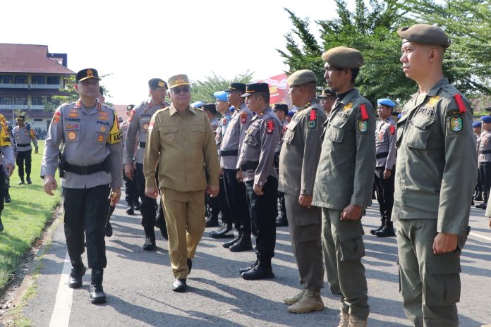 Pontianak, Kalbar – Dalam rangka persiapan pengamanan Perayaan Imlek dan Cap Go Meh dan pengamanan menjelang Pemilu Tahun 2024, Penjabat (Pj) Gubernur Kalimantan Barat, dr. Harisson, M.Kes., menghadiri Apel Pengecekan Kesiapan Personel serta Almatsus dan Gelar Pasukan Operasi Kepolisian Kewilayahan Mandiri Liong Kapuas 2024 yang dipimpin langsung oleh Kepala Kepolisian Daerah (Kapolda) Kalbar, Irjen Pol. Pipit Rismanto, S.I.K., M.H., di Lapangan Jananuraga Polda Kalbar, Jum’at (09/02).