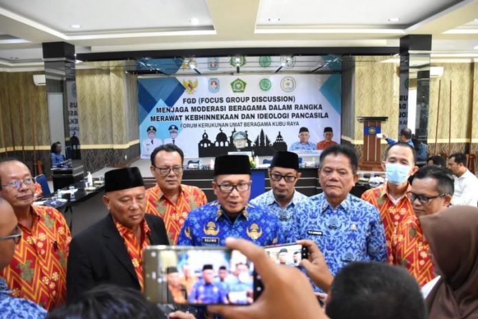 Kubu Raya, Kalbar – Wakil Bupati Kubu Raya Sujiwo membuka kegiatan Diskusi Kelompok Terfokus (FGD) “Menjaga Moderasi Beragama dalam rangka Merawat Kebhinnekaan dan Ideologi Pancasila” yang diinisiasi Forum Kerukunan Umat Beragama (FKUB) Kabupaten Kubu Raya, di Gedung Pusat Dakwah Muhammadiyah Kalimantan Barat, Sungai Raya, Kubu Raya.