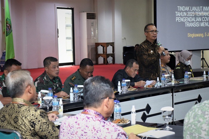 Singkawang, Kalbar – Pj. Wali Kota Singkawang Sumastro memimpin rapat koordinasi satgas penanganan Covid-19 Kota Singkawang di Basement Kantor Wali Kota Singkawang, Kamis (5/1). Rapat ini membahas tindak lanjut Inmendagri no 53 tahun 2023 tentang pencegahan dan pengendalian Covid-19 pada masa transisi menuju endemi.